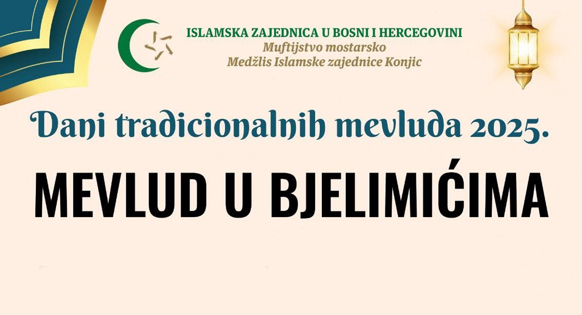 U okviru manifestacije Medžlisa Islamske zajednice (MIZ) Konjic “Dani tradicionalnih mevluda 2025” u nedjelju 07. septembra 2025. u 13:30h u džamiji u Odžacima, poslije podne-namaza biće održan mevludski program u Džematu Bjelimići. Spomenuti program će izvesti imami Medžlisa IZ Konjic, a predavač će biti imam Gazi Husref-begove džamije, hfz. mr. Hamza ef. Lavić.